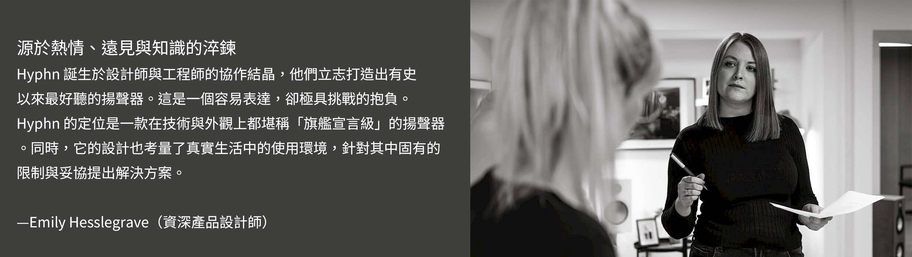 Hyphn的誕生匯聚了三大關鍵要素,可謂音響技術在特定時代背景下淬鍊而成的獨特結晶:我們對人類聽覺科學的透徹掌握、紮實的工程技術底蘊,以及作為獨立企業所擁有的創作自由。