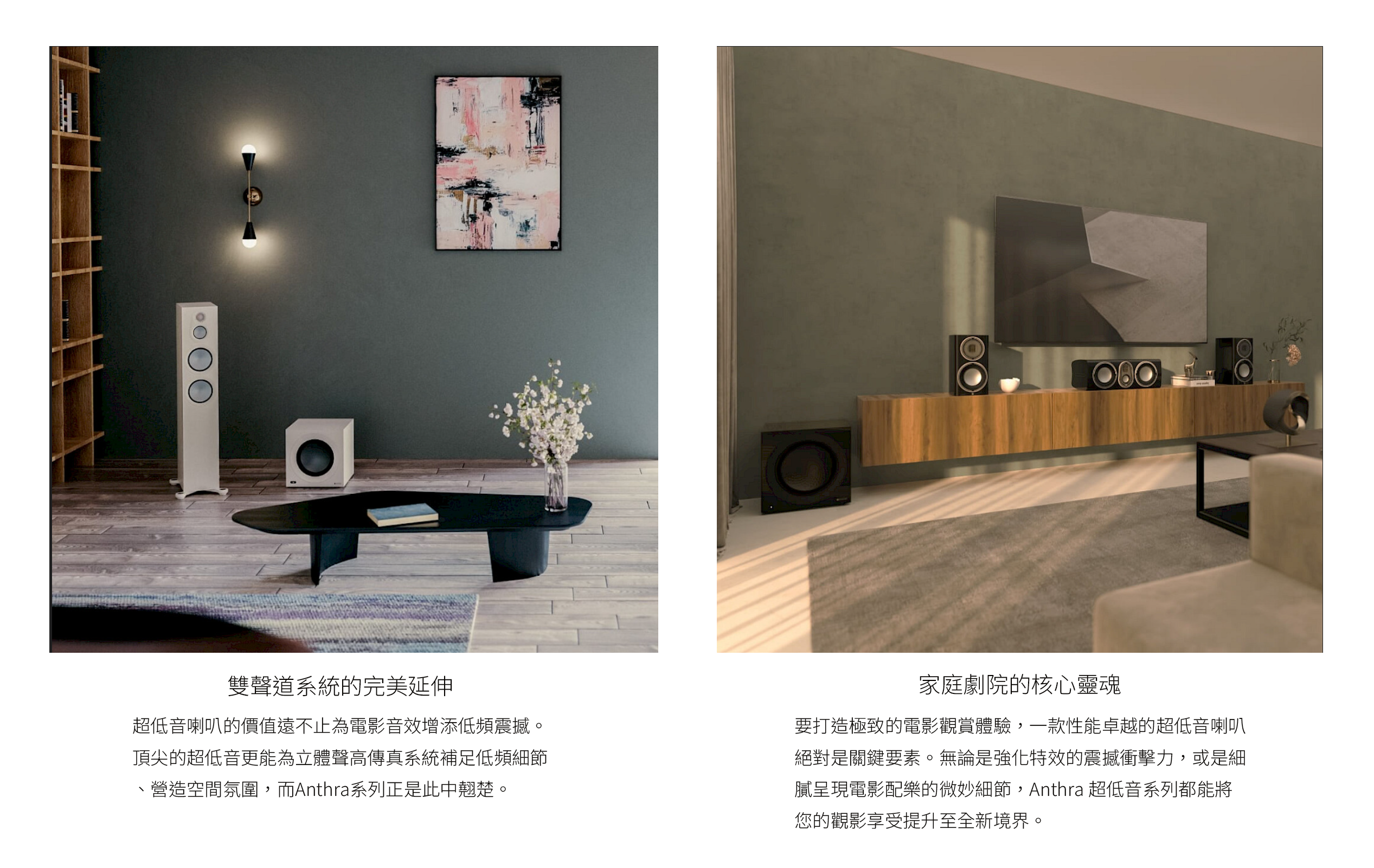 Anthra 系列以無可挑剔的機體做工、直覺化的控制介面與人性化應用程式,成就非凡的整體表現。更值得一提的是,此獨立超低音系列提供絕佳的系統搭配彈性,使用者可完全根據預算需求、性能表現與個人偏好自由選擇,無需受限於特定揚聲器系列的束縛。