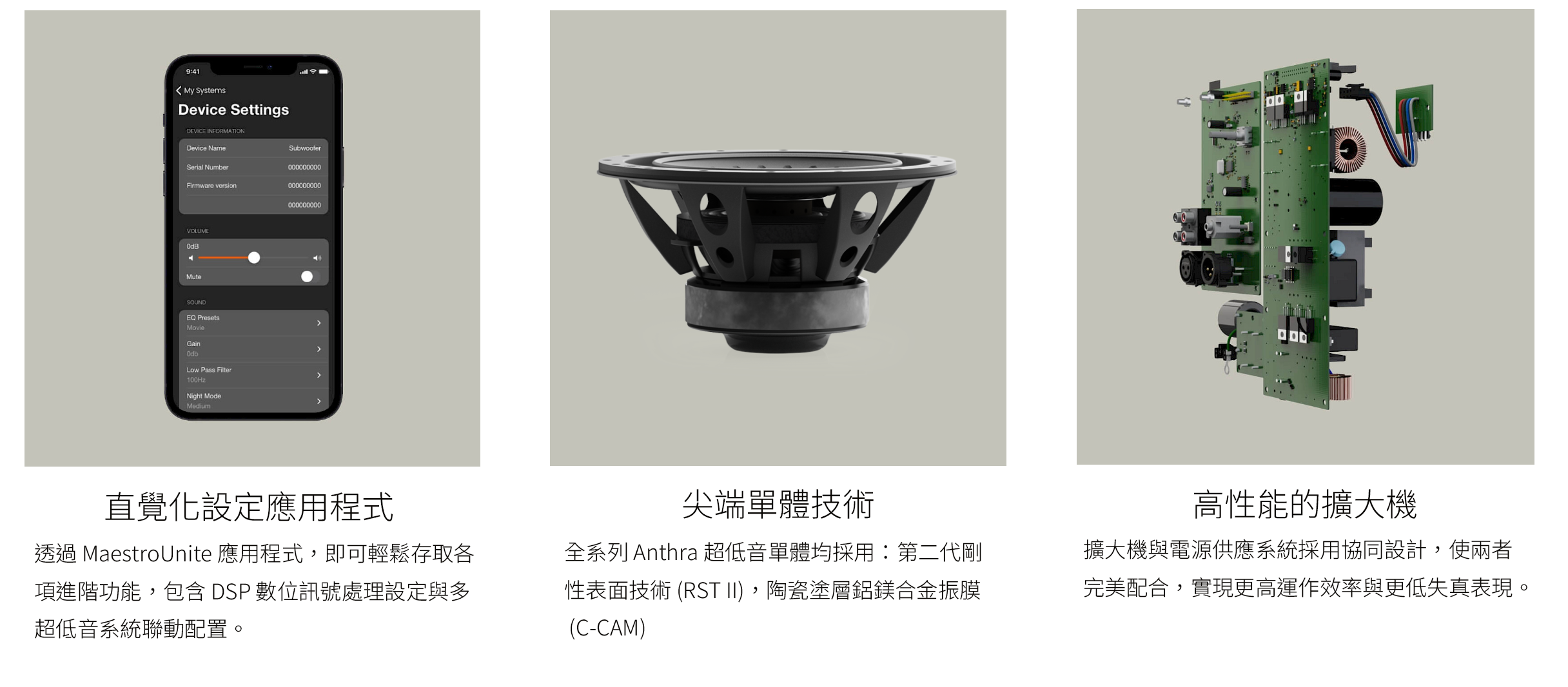 Anthra 超低音系列的三款型號,皆以「音樂性」與「控制力」為核心進行聲學設計。憑藉專業的聲學技術與扎實的結構設計,全系列產品都能展現驚人的低頻下潛深度,同時兼具優異的音樂表現力與敏捷瞬態反應。